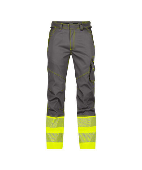 Pantalon stretch classe 1. Ceinture fermeture à glissière et bouton jeans caché, réglable au dos par élastique. 6 passants. 2 poches italiennes. Poche cuisse. Porte-crayon, poche mètre, poche cutter, poche téléphone et boucle pour porte-badge. Poches arrière plaquées dont 1 avec rabat. Poche de sécurité cachée avec fermeture à glissière. Coutures triples. Bandes réfléchissantes segmentées de 80 mm. Coupe ajustée.