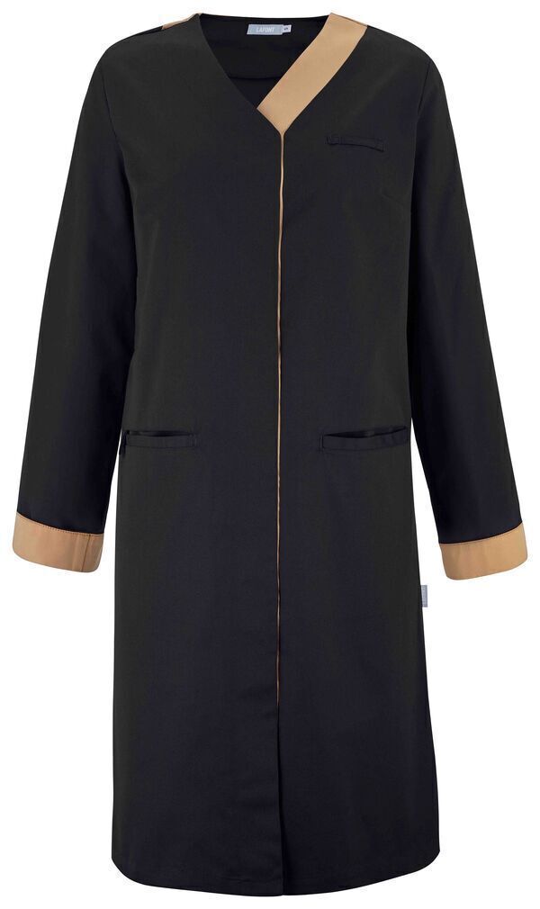 Blouse femme. Fermeture milieu devant par boutons-pression cachés. Passant porte-badge côté gauche, 2 poches passepoilées dont une à 3 compartiments et un passant pendoir côté. Oeillets d'aération brodés sous les bras, manches longues retroussables avec bas de manches revers contrastés. Longueur : 100 cm.