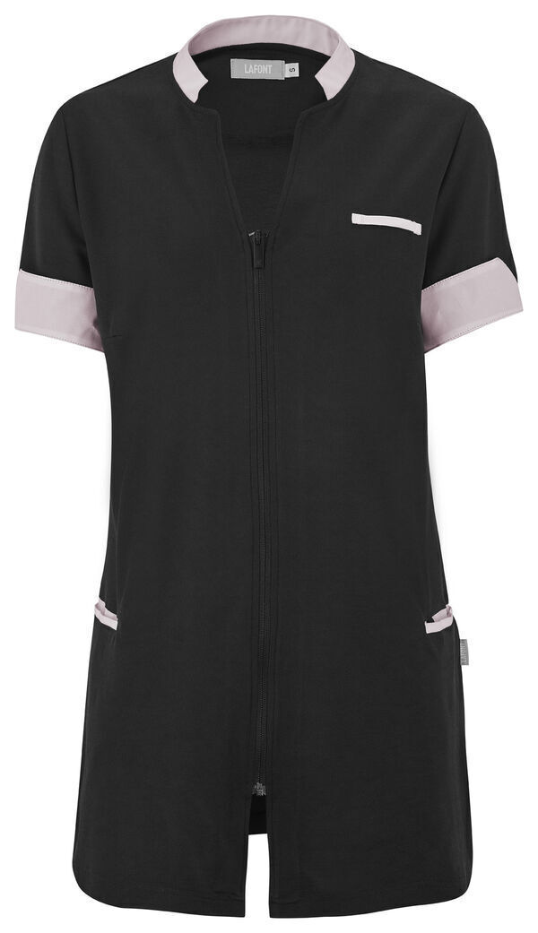 Tunique femme. Col biseauté, fermeture par zip milieu devant. 2 poches côtés et 1 passant pendoir côté droit. Hautes fentes côtés laissant apparaître le fond de poche contrasté. Œillets brodés d'aération sous les bras, manches courtes avec fente biseautée et bas de manches avec parement intérieur contrasté. Longueur : 75 cm.