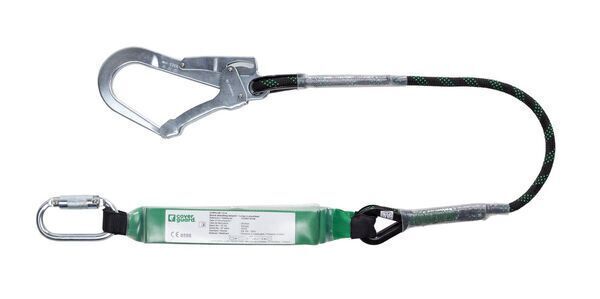 Longe absorbeur en corde tressée 11 mm. Équipée d'1 mousqueton acier automatique 1/4 de tour et 1 connecteur double action acier ouverture 50 mm. Existe en longueur : 1,3 m et 1,8 m. | Testé 100 kg.