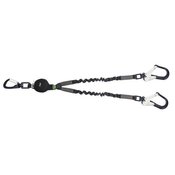 Longe en sangle élastique polyester. Largeur : 35 mm. Spécialement conçue pour résister aux arêtes vives. Longe fourche en sangle élastique. Absorbeur d'énergie en sangle à déchirure. Largeur : 45 mm. 2 mousquetons d'échafaudage aluminium ouverture 60 mm, avec émerillon et témoin de chute. 1 crochet aluminium à verrouillage automatique 1/4 de tour ouverture 18 mm. Boucles protégées. | Montage connecteurs à émerillon 360°.