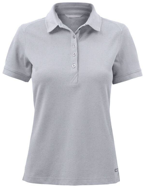 Polo femme tri-blend, stretch. Col avec patte à 5 boutons. Fentes latérales. Manches courtes. Finition bord-côte. Dos rallongé.