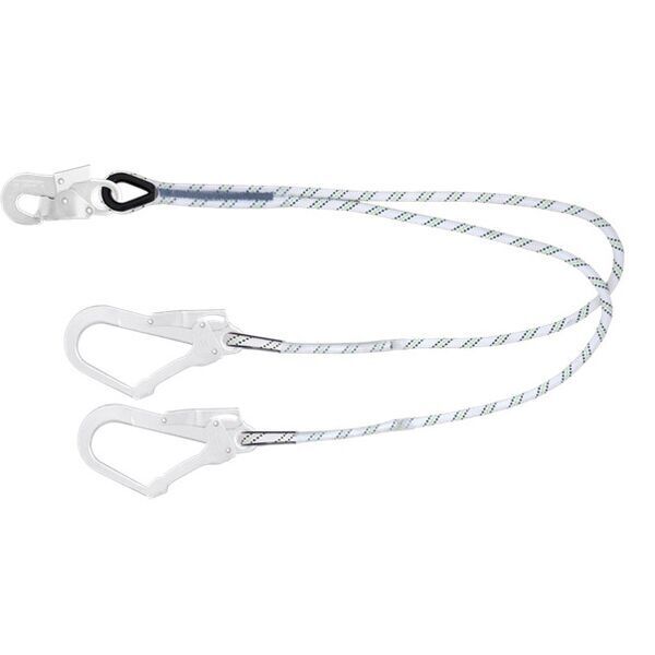 Longe fourche en corde tressée 11 mm. 1 mousqueton acier à verrouillage automatique ouverture 18 mm. 2 mousquetons d'échafaudage à verrouillage automatique ouverture 50 mm. Boucles cossées. Coutures protégées par gaine transparente.