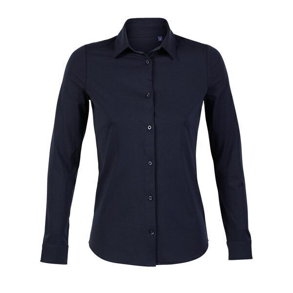 Chemise femme en jersey. Col italien. Boutonnage 7 boutons ton sur ton. Manches longues. Poignets arrondis 2 boutons ajustables et patte capucin. Jersey mercerisé.